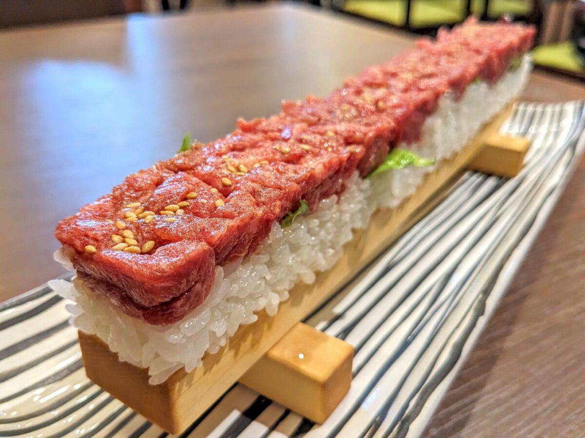 さあ、こちらがロング押し寿司ユッケ(ハーフ)。木枠に入った状態でテーブルに届き、目の前で枠を外してくれます。押し寿司登場シーンはなかなか盛り上がりそうです!