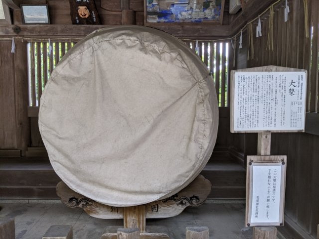 そんな楽器の中で最も大きなものが、こちらの大鼕(おおどう)。樹齢1000年のケヤキをくりぬいて造られた直径157cmにも及ぶ大きな太鼓で、明治時代に奉納されたもの。現在も、毎朝8:30の朝御饌祭(あさみけさい)や特定の祭典時に使用されているそうです。
