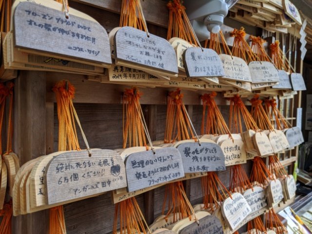 芸能人の絵馬は、一般の絵馬に比べて黒く年季が入っています。おそらく芸能人の方が参拝したときに納めたものを、長年下げずに一番前にくるようにしているのではないでしょうか。