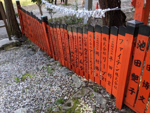 神社のまわりにめぐらされている朱色の玉垣。そこには、神社に寄進した企業や団体の名前が書かれています。