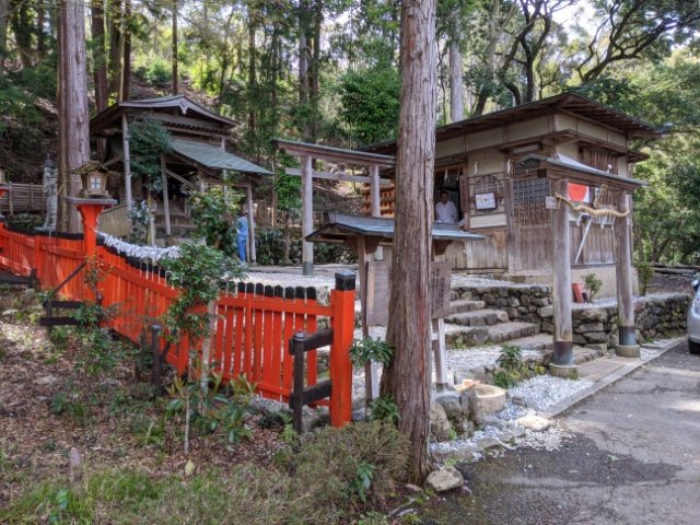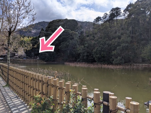 竹林の小径を抜けた先にある小倉池のほとりに静かに建っています。なお、この池はカワセミが観察できるらしく、三脚を構えたバードウォッチャーの方がたくさん集まっていました。