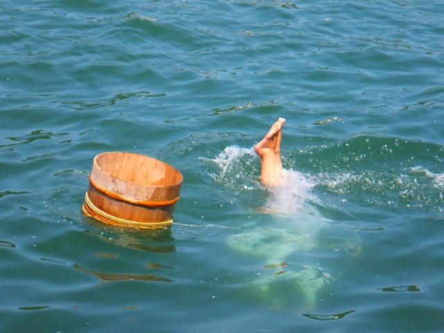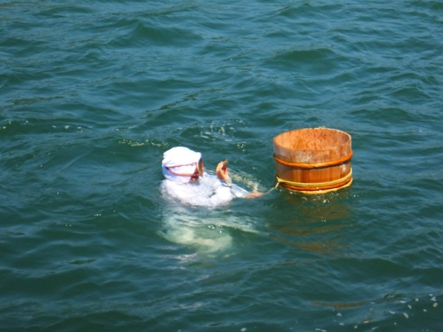 すぐにアワビにような貝を手に浮上してくる海女さん。お見事です。かつて鳥羽の海女さんは、漁はもちろん、アコヤ貝の採取や核を入れたアコヤ貝を海に戻すといった真珠養殖に関わる働きをしていたそうです。今では養殖技術の発達のため素潜りして貝を移動する必要はなくなりましたが、鳥羽の真珠養殖が発展を陰ながら支えてきていたのです。