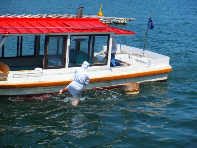 さあ、船に乗った海女さんがやってきました!海へ飛び込む海女さんたちは、まるでボートダイビングのように背中からバックロールエントリーしていきます。