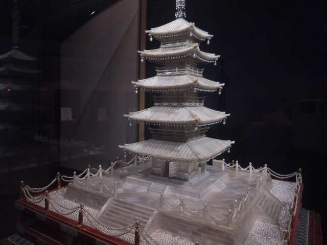地球儀よりさらに多い12,760個もの真珠でできた『御木本五重塔』もあります。真珠はひとつずつ若干色味が異なっており、たくさん集まるとグラデーションがかかったような姿で神秘的。見ていると吸い込まれそうです。