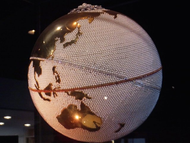 真珠博物館の2階には真珠を加工して作られた美術工芸品も多数並んでいます。こちらは真珠でできた『地球儀』。使用している真珠は驚きの12,541個!さらに赤道部分はルビー、黄道は部分ダイヤでできているという、目が眩む作品です。
