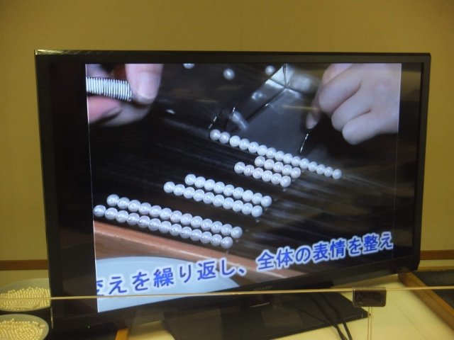 中でも気になったのは「連組み」の映像。ネックレスを作るため、大きさ色が同じ真珠を並べていくのですが、その手際のあざやかなこと。タタタッと一定のリズムで真珠を弾く音も気持ち良く、まるでピタゴラスイッチのようにずっと見ていられそうです。
