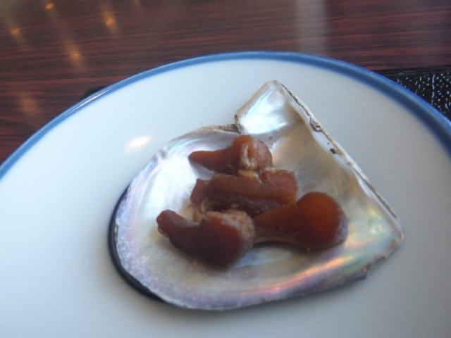 こちらがアコヤ貝の貝柱。真珠貝の貝殻がお皿代わりでちょっぴりゴージャス。気になるお味は、クセがなくサッパリとしてました。