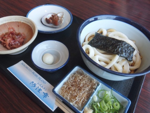 こちらは『真珠うどん』。ご当地グルメの伊勢うどんに、アコヤ貝の貝柱醤油煮がセットになったメニューです。