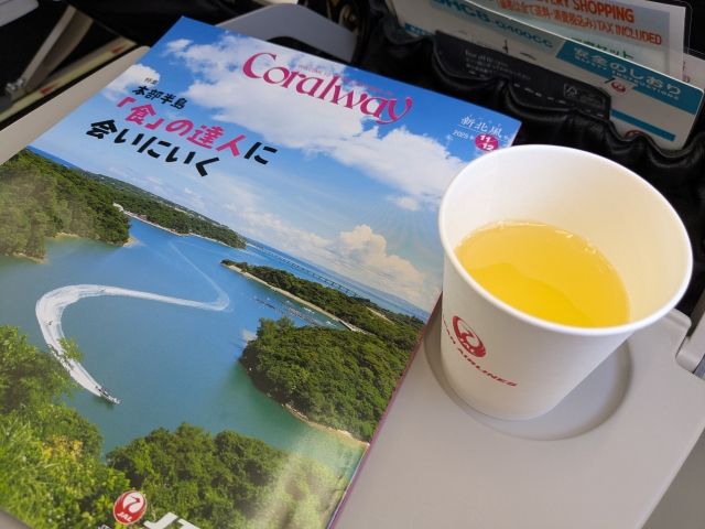 機内サービスのシークワーサージュース片手に、機内誌のCoralwayを読破。沖縄離島の情報がたっぷりで楽しい!