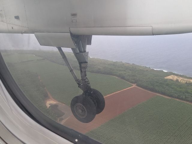 見えてくる南大東島の一部。かなり揺れながら、まるでアトラクションのような勢いで着陸しました。