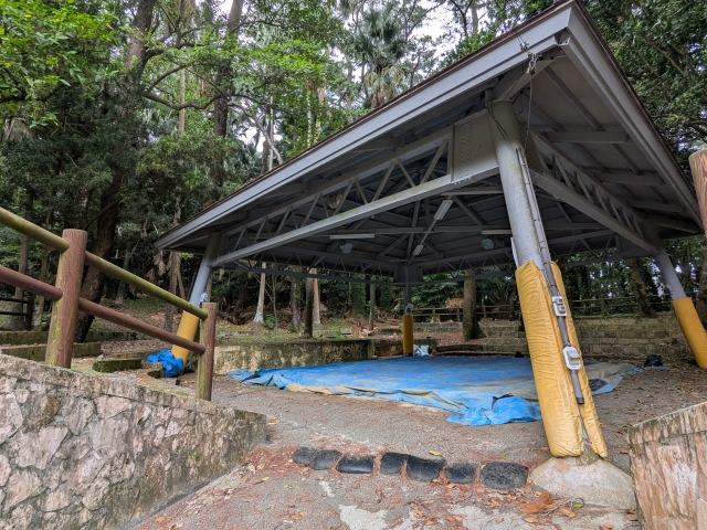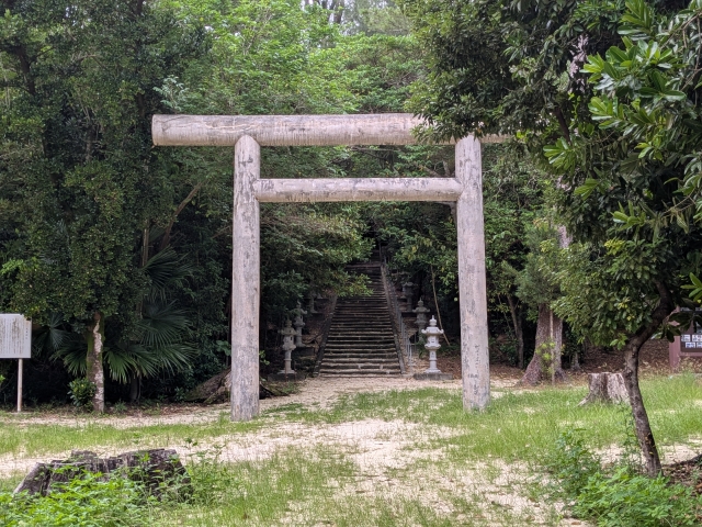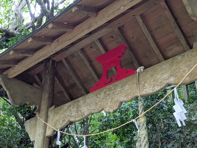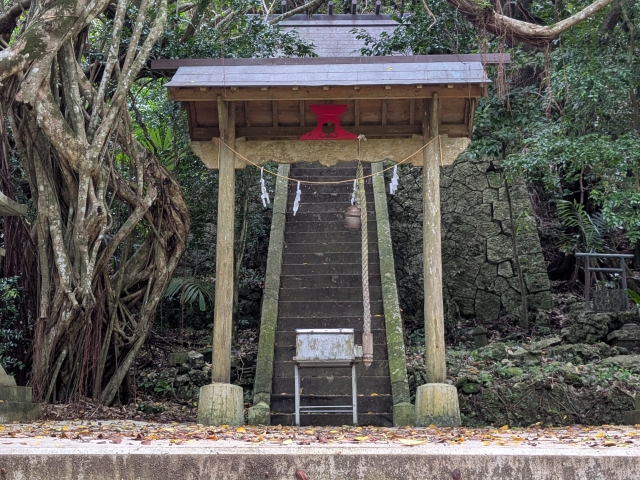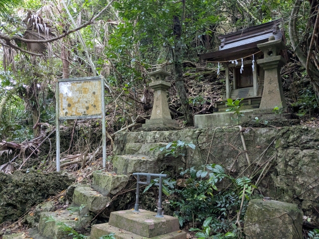 生い茂る森に包まれた神秘的な空気が漂うスポット。島の開拓団が入植時に建立した神社であるため、島における人の営みを最初から見守ってきた神社なのです。夜はダイトウオオコウモリを観察できるスポットでもあるようです!