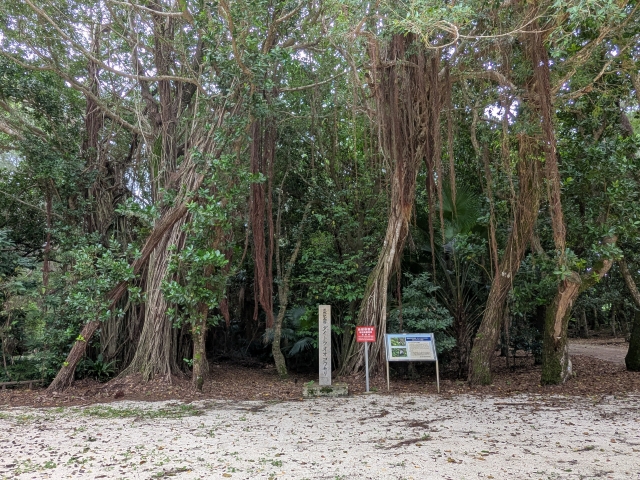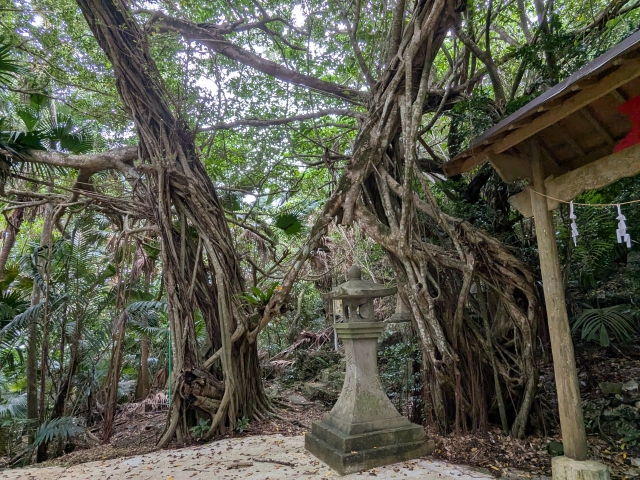 直ぐ側に生えるガジュマルはかなり立派な姿。ガジュマルは枝から垂れ下がる縄のような「気根」が地面につくと、そこから幹へと成長していきます。もともとの幹はやがて腐ってしまうため、移動する樹木なのです。このまま進むと、いずれ神社と一体化してしまいそうですね。