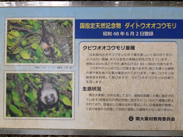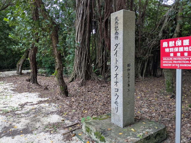 ダイトウオオコウモリは、南北大東島にのみ生息する動物。絶滅危惧種IA類にも指定されています。この森は、そんなダイトウオオコウモリの生息地。夜間に訪れると、多数のコウモリが飛び交う様子を観察できるそう。