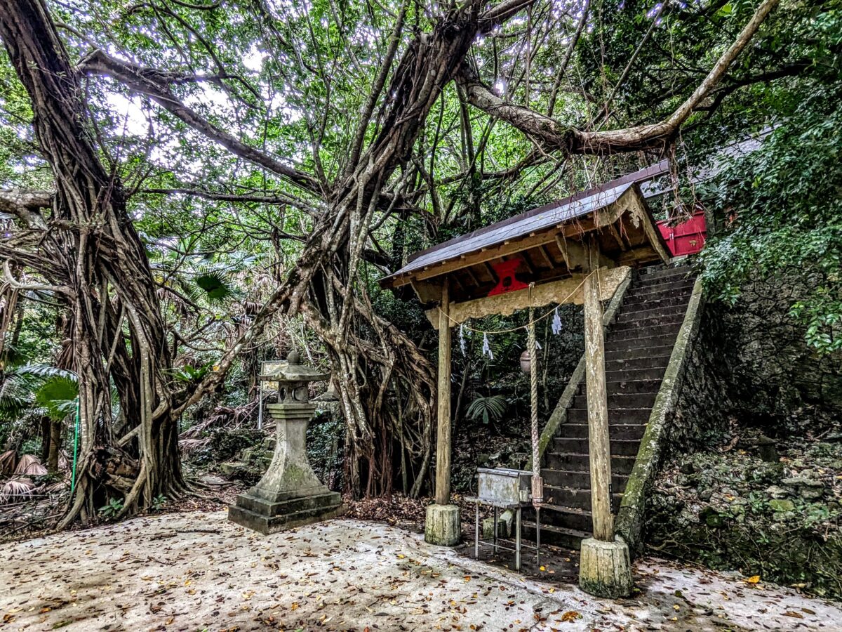 直ぐ側に生えるガジュマルはかなり立派な姿。ガジュマルは枝から垂れ下がる縄のような「気根」が地面につくと、そこから幹へと成長していきます。もともとの幹はやがて腐ってしまうため、移動する樹木なのです。このまま進むと、いずれ神社と一体化してしまいそうですね。