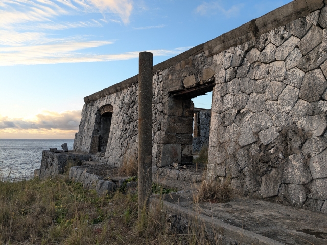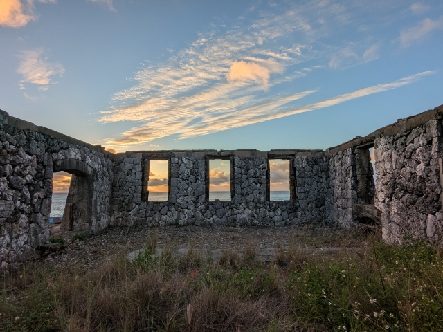 珊瑚石灰岩を乱積にしたという壁は、遺跡のような姿でとっても魅力的!廃墟や近代化産業遺産が好きな方には刺さりまくるスポットです。夕方に訪問したところ、ちょうど夕陽のタイミング!窓枠から差し込む真っ赤な光は、感動的な演出です。