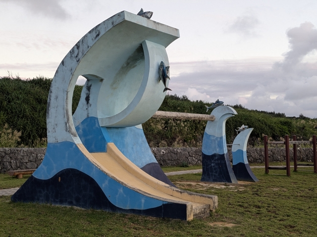 波の様なオブジェが置かれており、マグロらしきサカナが泳いでおります。よく見るとすべり台になっており、かつてブランコが吊るされていたであろうスペース、そして鉄棒が一体化した遊具でした。