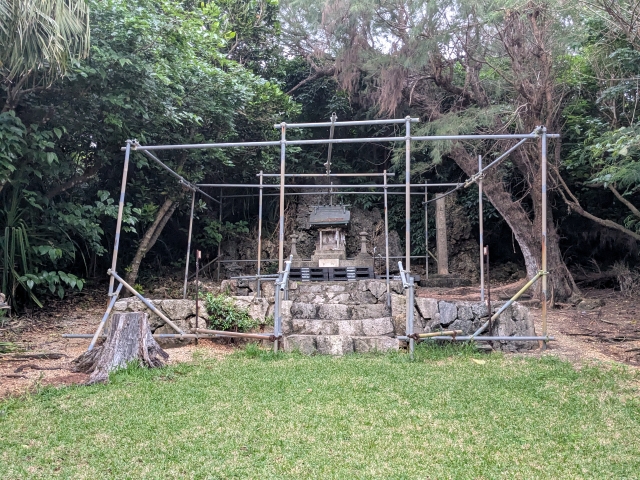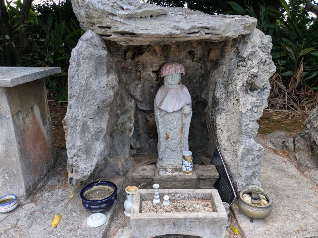 右から2番目の花崗岩の地蔵は、明治の末に大沢仁太夫の妻ソイが立てたものとのこと。大沢仁太夫は明治33年に南大東島に来島、開墾に従事した人物であり、妻ソイがその遺言により建立したそうです。