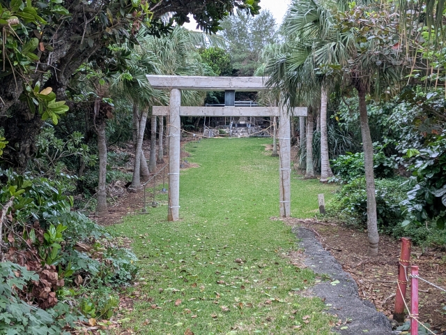 西港の南大東島開拓百年記念碑のそばに立つ鳥居。この先に鎮座するのは金比羅宮。