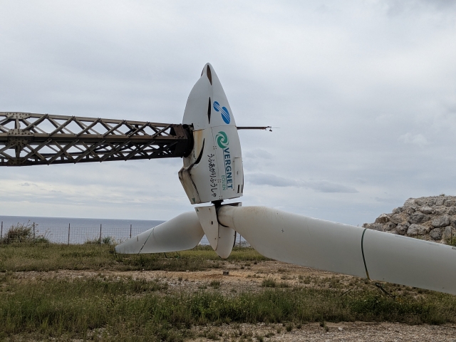亀池港から細い道を上った先には倒れた風車が見えます。こちらは故障中ではなく、強風の際に倒して倒壊を防ぐ可倒式風車。台風の影響が強い沖縄の離島では時折見かけるタイプの風車です。