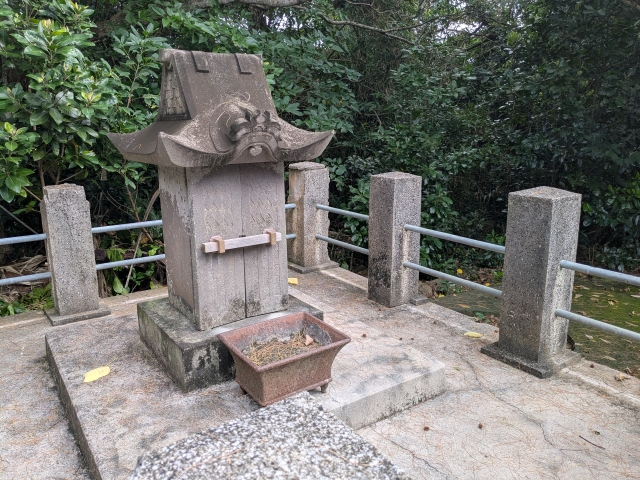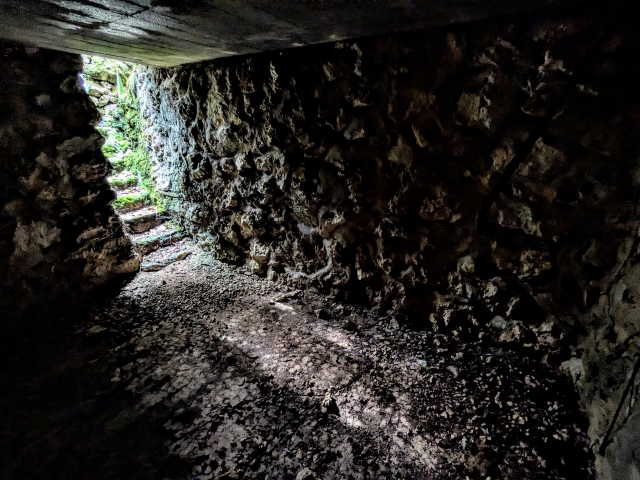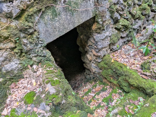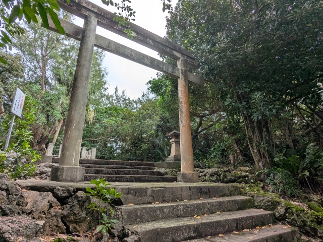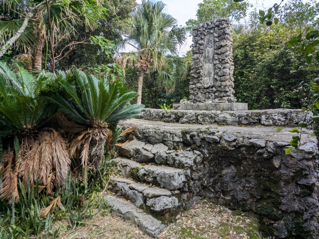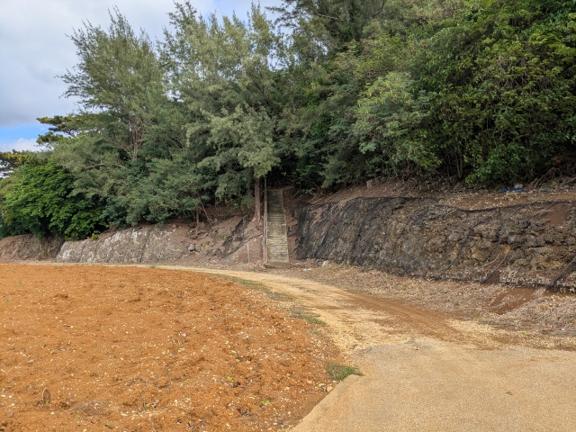 不安になってきたところで見えてくるのは、石垣の上に建つ石碑。こちらは忠魂碑といい、島での戦没者の慰霊のために建立されました。この南大東島は、太平洋戦争時に激しい空爆を受けた戦地。多くの人が命を落としたとききます。
