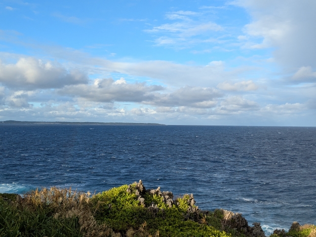 南大東の海岸線はほとんどが崖ですが、ここも例外ではありません。切り立つ崖に立つと、目の前には太平洋の大海原!海の向こうに目をやると、北大東島が見えます!すごく平坦な島に見えますね。
