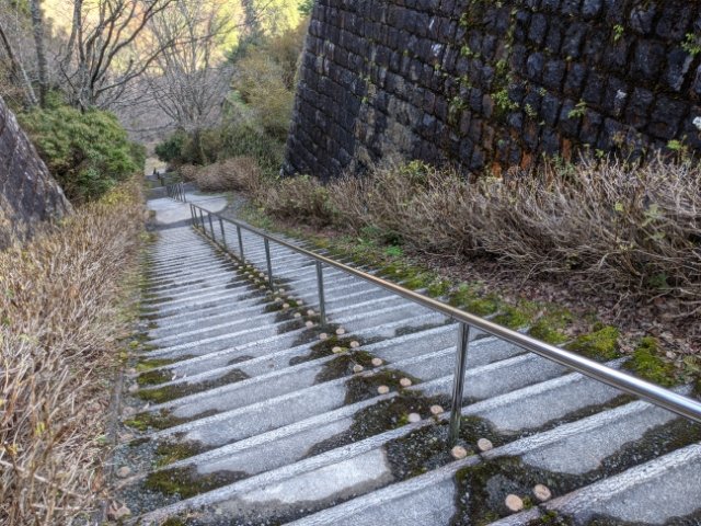 この2つを見るには、駐車場から220段の階段を降りていきます。この階段は、かつて利用されていたインクラインの跡を利用したもの。(※インクライン=ケーブルカーのこと)