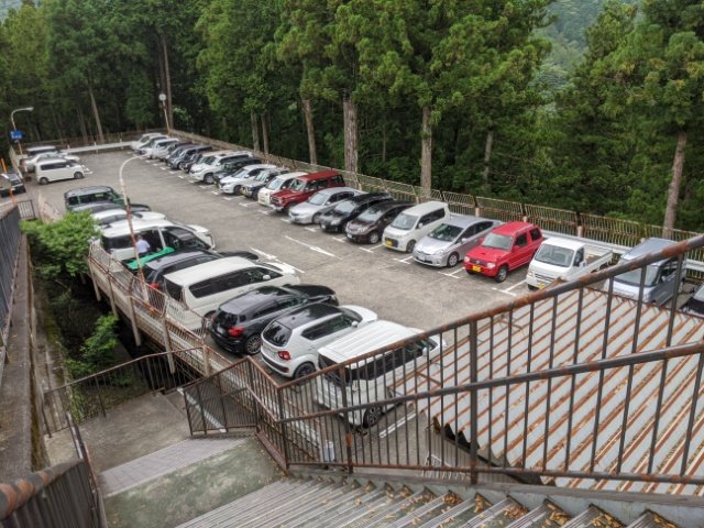 おそらく一番最初に見かける駐車場。本堂から最も離れており、三門まで徒歩20分ほどかかり、そこから長い石段の菩提梯を登ることになります。遠い上に有料のため、門前町からじっくりと味わいたい人向けではないでしょうか。