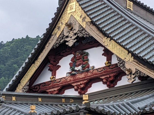 煌びやかな装飾が施された絢爛な姿。数多くの彫刻が彫られているのですが、私が気になったのは破風にいるこの赤いお方。屋根を支える姿は邪鬼のようですが、それにしては貫禄があります。どちらかといえば風神・雷神といった神様のよう。検索してみたところ、「力神」というらしい。そして、実は東西南の3方向に設置されているそう。そこまで気が付けませんでした。