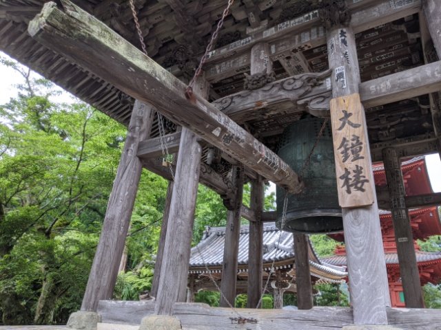 吊るされた巨大な鐘。鐘をつくための撞木も3mほどあります。早朝と夕方に撞かれるのですが、この作法がかなりアクロバティックとのこと。動画検索してみたところ、地面に背中が付くほど綱を引いて鐘を撞いていました。