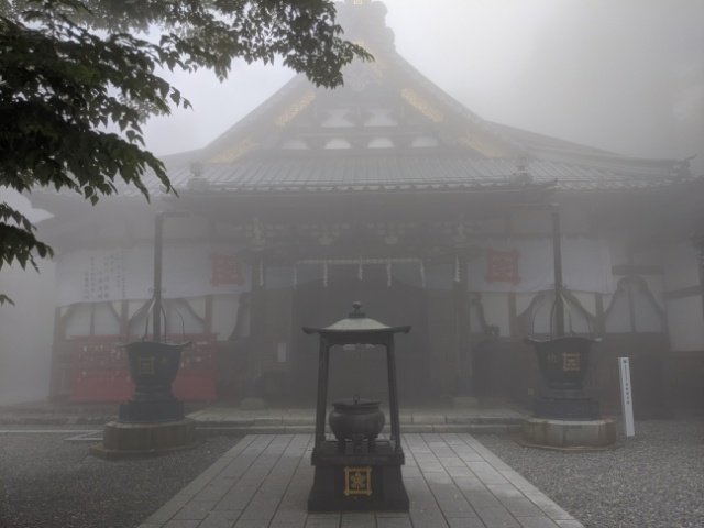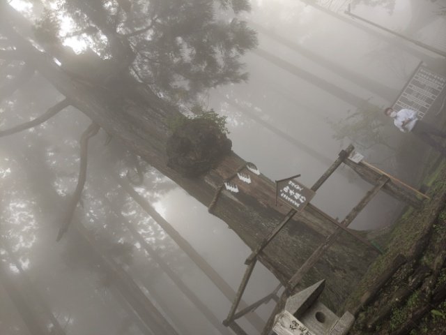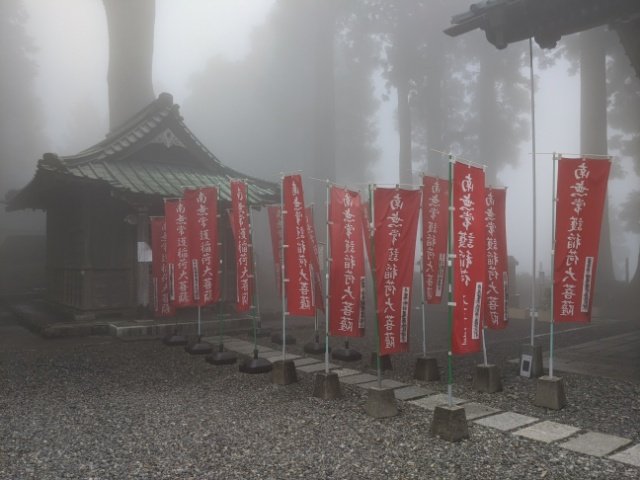 奥之院への参道が繋がるのですが、霧で数メートル先までしか見えません。景色は楽しめませんでしたが、幽玄さが際立っており雰囲気抜群。