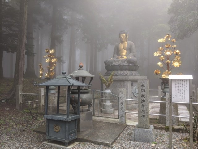 本堂の奥には、金色に輝く釈迦牟尼像。霧に包まれた森を背景にした姿はとても神秘的です。