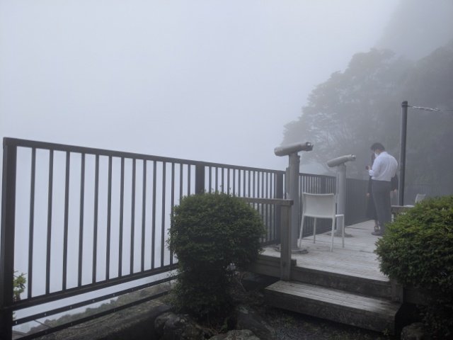 ロープウェイの山頂駅を降りると展望台が・・・あるのですが、霧で何も見えません。