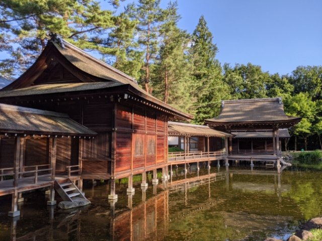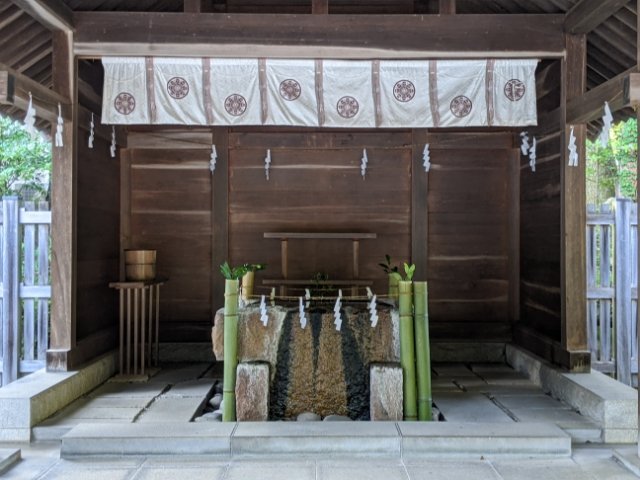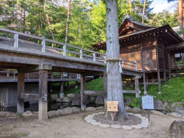 一方、こちらは水祥殿。御神水の井戸を祀っており、車の清め祓いの神事を行っているそう。この御神水というのは、八ヶ岳より流れる湧き水。降り注いだ雨や雪が伏流水となり、80年という長い歳月をかけてここまで流れてくるそうです。