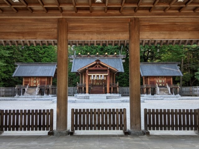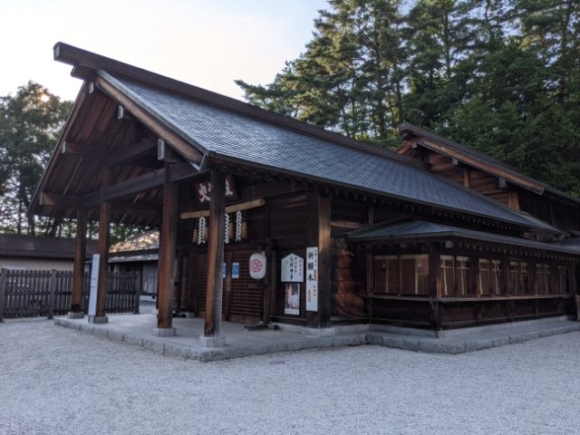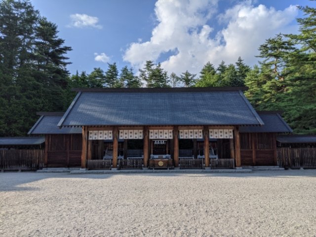 装飾などはほとんどない古来の姿は、伊勢神宮と同じ「唯一神明造」。切妻屋根の上には鰹木(かつおぎ)と呼ばれる木が並べられており、端には千木(ちぎ)が交差するように伸びています。