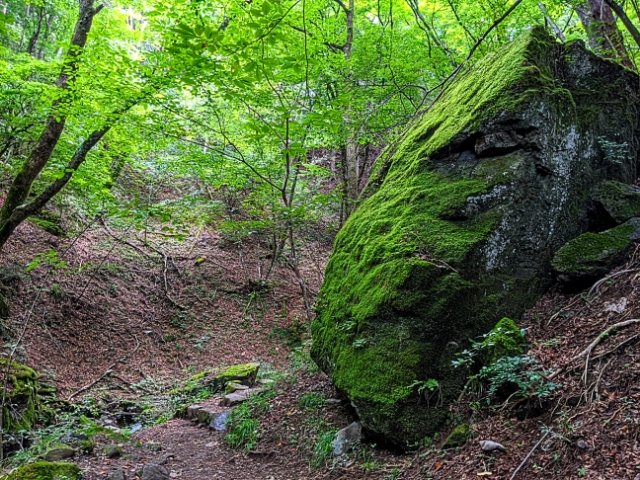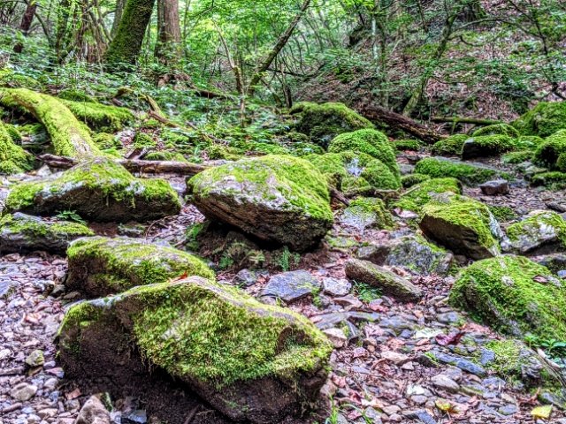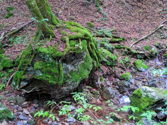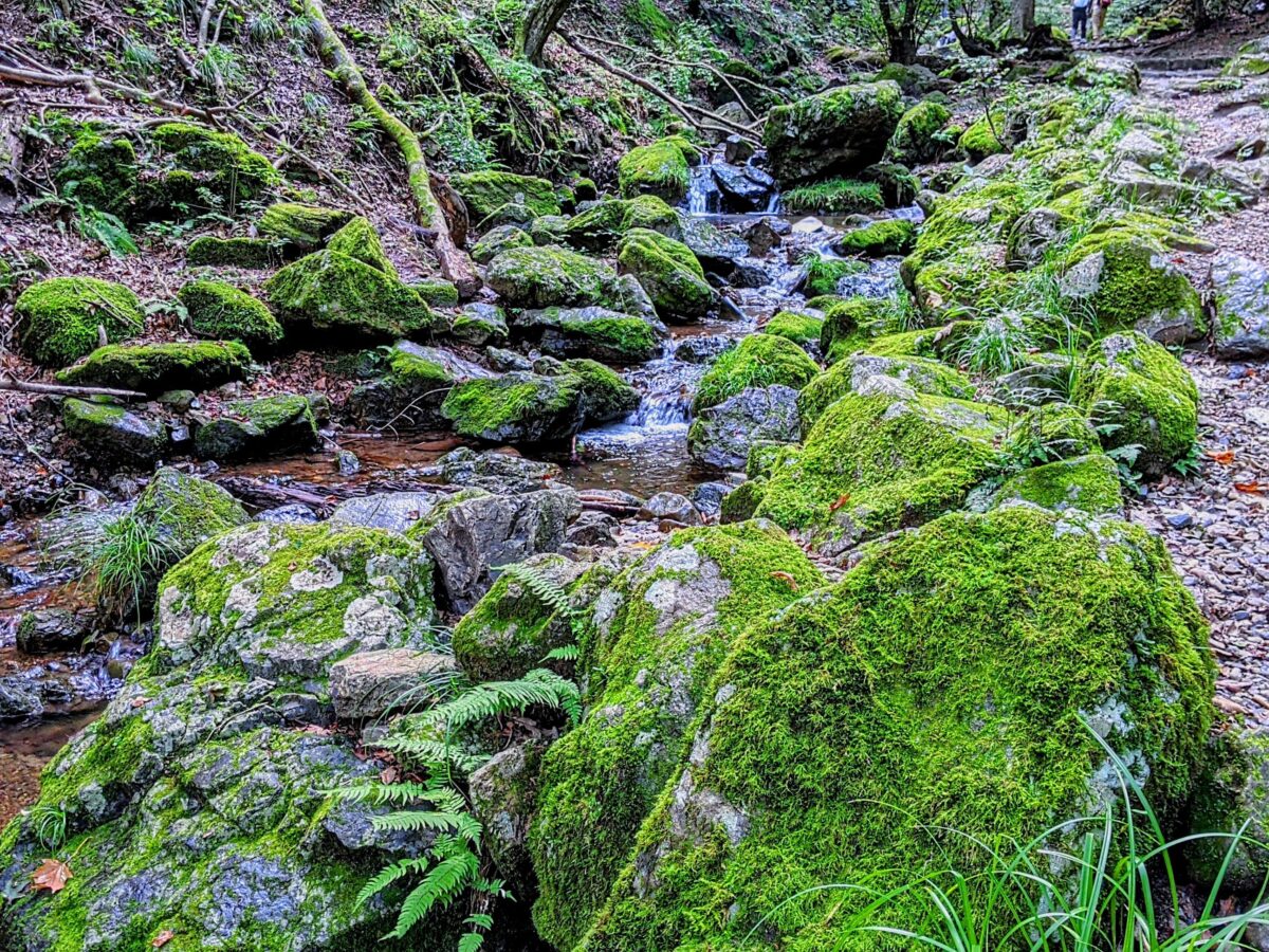 せせらぎを囲むように大きな石がゴロゴロと転がったエリア。フサフサに苔むした姿は、長い年月を感じさせます。渓流と苔の姿からは、「東京の奥入瀬」と呼ばれていたこともあるそう。
