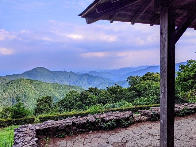 目の前に広がるのは、うねるような山々。尾根を這うように張られた電線が、なんとも東京らしい光景です。東を向いているため、遠くにはうっすらと都心の街並みが見えます。