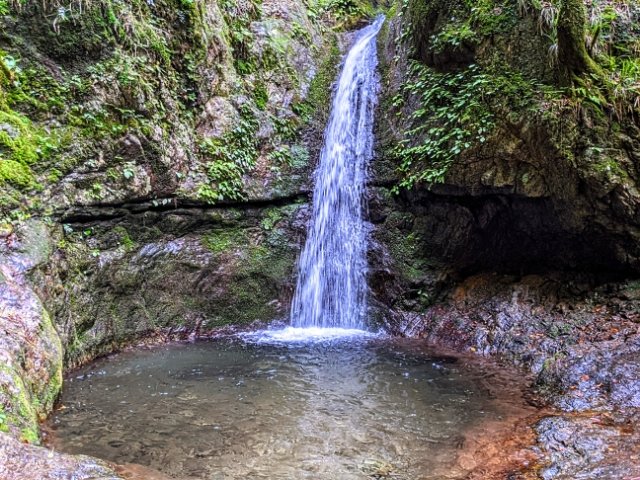 バシャバシャと勢いよく流れる立派な滝。落差は5mほどと、それほど大きな滝ではありませんが、山道の苦労が上乗せされてなんとも感動的!飛び散る水しぶきが心地よいです。