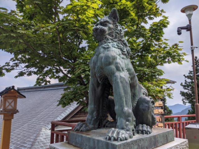 また、日本武尊命が東征を行った際に道案内をしたとして、大口真神(オオカミ、おいぬ様)を祀っています拝殿の前には、北村西望作の立派な神狗の姿もみかけました。