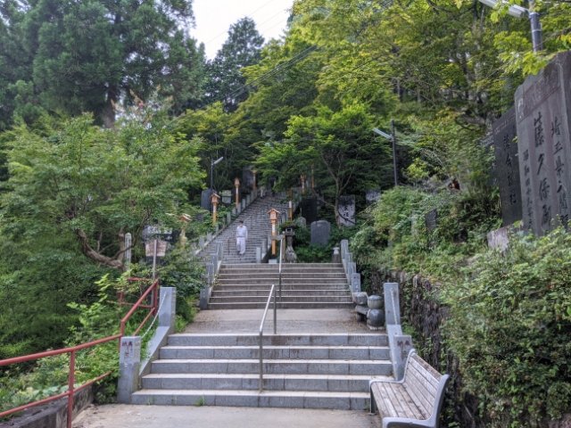 しばらく進むと、そびえる石段が。ここは武蔵御嶽神社境内への入口。この神社は御岳山山頂に建っているため、なかなかハードな石段が続きます。距離はそれほどでもありませんが、傾斜が急なのと、日陰が少ないため体力を消費します。