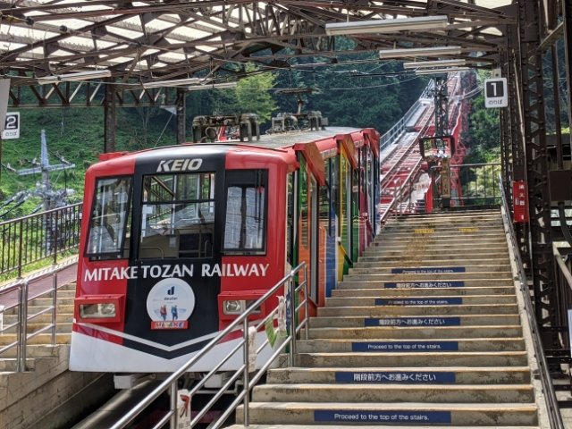 カラフルな車体がかわいい御岳山ケーブルカー。高低差424mをおよそ6分で進みます。料金は片道600円。運行間隔は1時間に2本ほど。