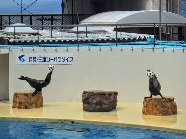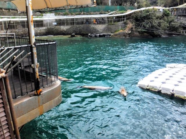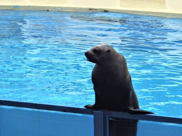 続いてカリフォルニアアシカの息ぴったりなパフォーマンス。サッカーボールやテニスラケットを鼻の上で上手くバランス取ってます。