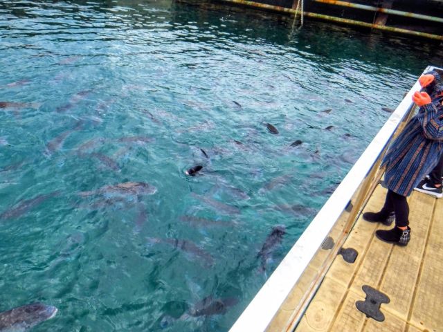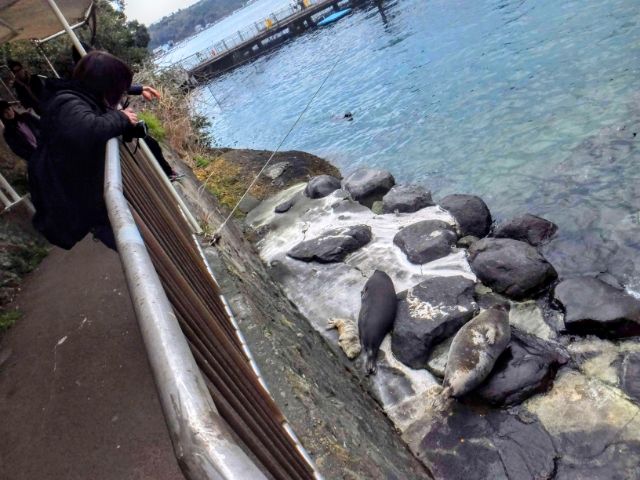 このアシカたち、マダイ同様に餌付けされており、人が来ると集まってきます。ここではアシカにエサやりというこれまたレアな体験もできるのです。