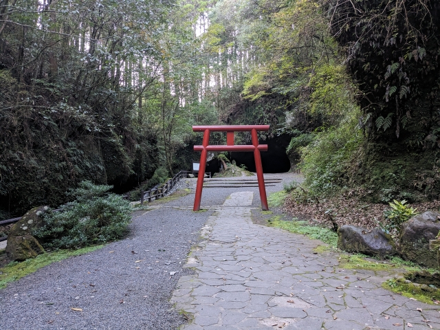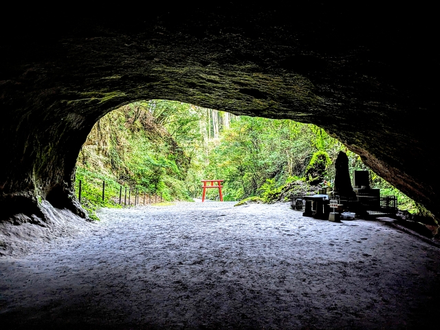 豊かな自然が洞窟の縁で切り取られる様子は神秘的。赤い鳥居が良いアクセントになっています。