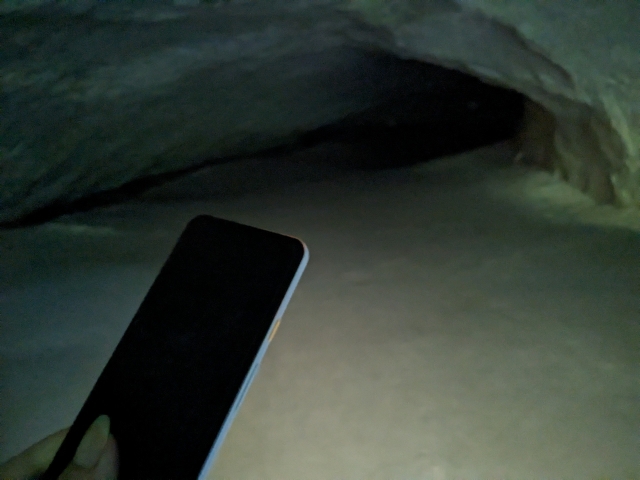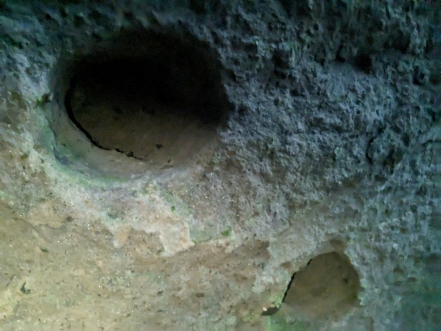 入口には懐中電灯が2つ設置されていましたが、電池切れなのか点灯しませんでした。ということでスマホのライトで照らしてみましょう!一人で来ているため写真を撮れないかと思いきや、たまたまスマホ2台持ちだったのでなんとかセーフ。