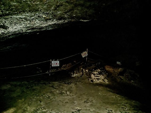 暗い洞窟は距離感がわかりにくいのですが、おそらく20〜30mほど進んだあたりには立入禁止の看板が。これ以上は進めないようになっています。