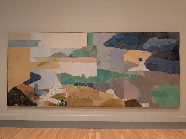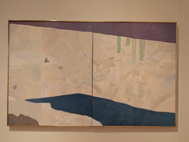 日本画らしい彩色で描かれた大きな絵画。近づいてみると絵の具の「塗り方」で様々な模様が描かれています。抽象表現に見えますが、手前の植物や遠くの山など、リアリティのある表現も多数見ることができる不思議な作品です。