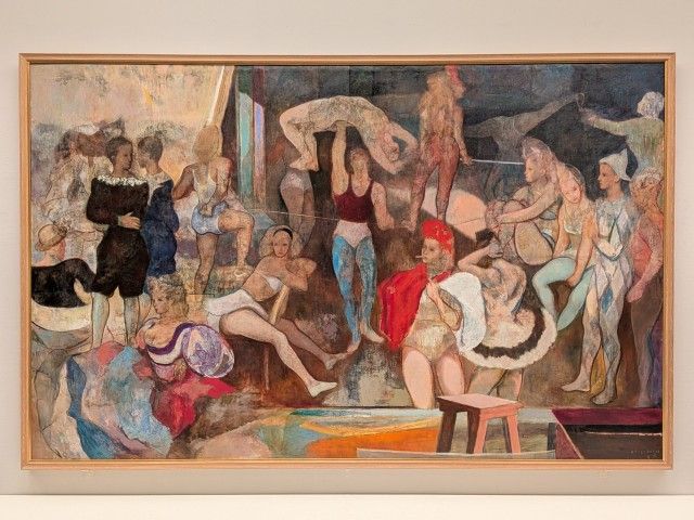 戦争が終結したのち、1947年の作品。色鮮やかな油絵具で描かれているのは、曲芸師の楽屋のような風景。リラックスしている人や、訓練している人など、それぞれの人物を追っていくと面白いです。