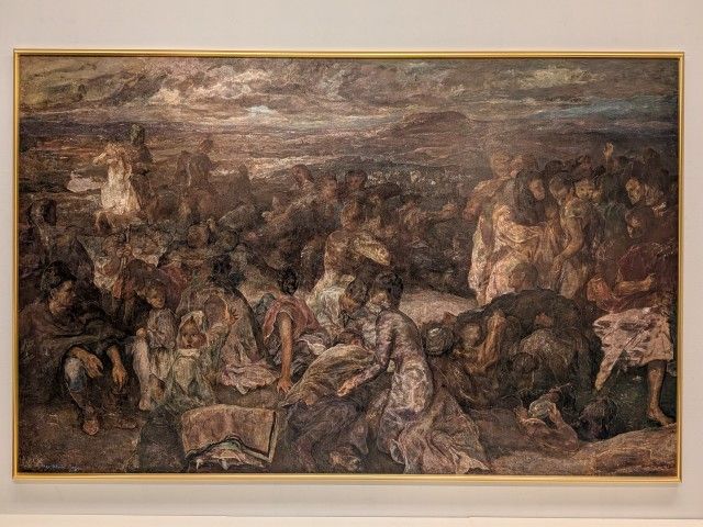 華やかさのないダークな作品。ぱっと見では何が描かれているか分かりにくいですが、目が慣れてくると無数の人々が折り重なった様子が見えてきます。1943年という戦時中であるからこそ生まれた絵画なのでしょう。