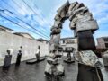 帰り際、1階のエントランスにつながる吹き抜け空間に、鉄骨が吊るされているのを発見しました。