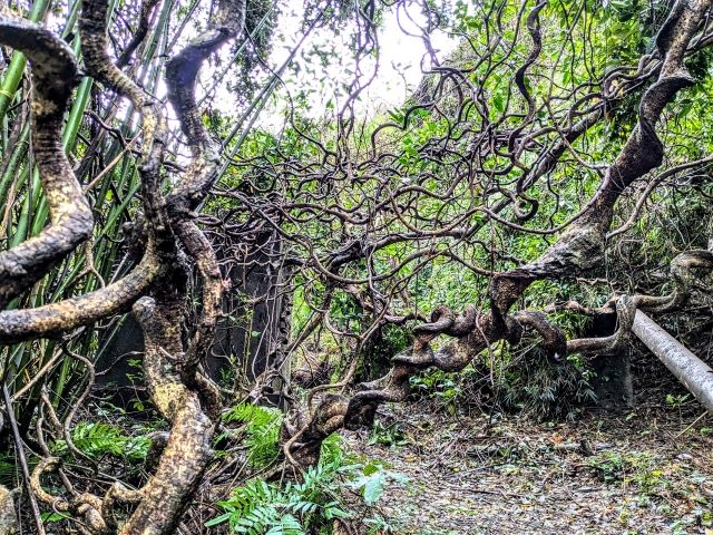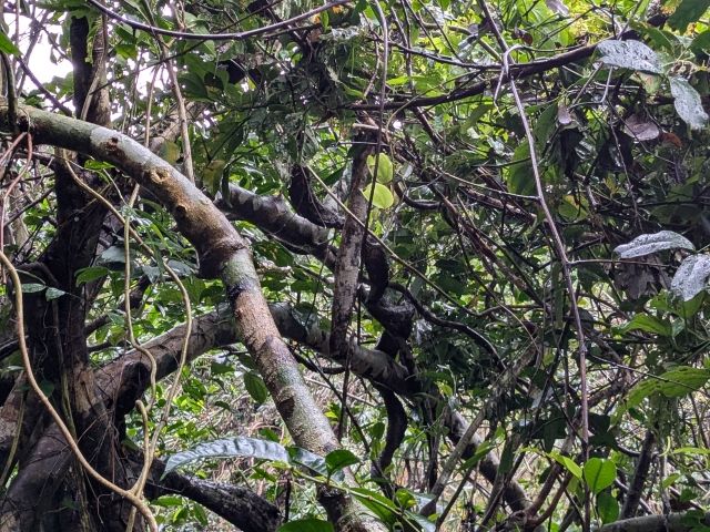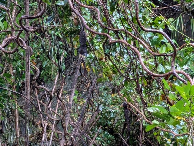 あたりを見渡すと、うねうねとツルが広がっています。どうやらこの木がモダマのようです。さあ、サヤを探してみよう!